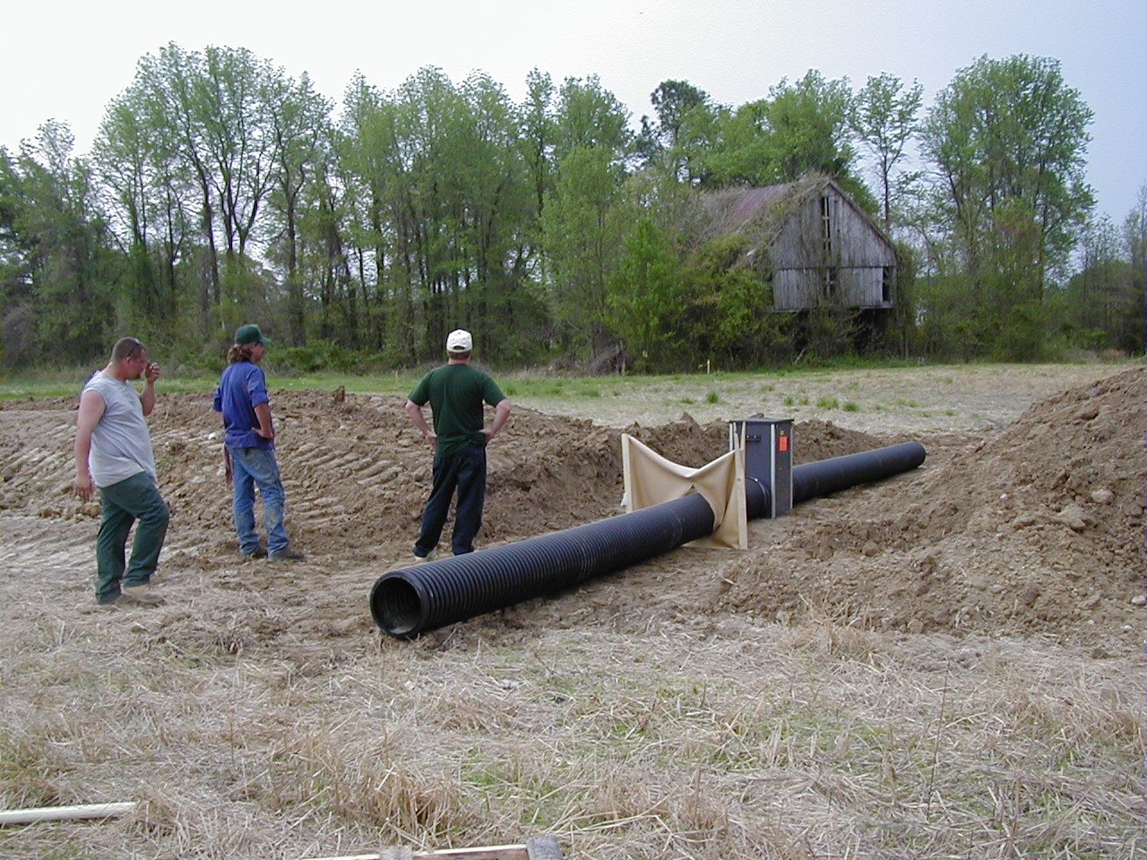Picture showing intake pipe (foreground), output pipe, anti-seep collar (beige item around pipe) and water level control structure.