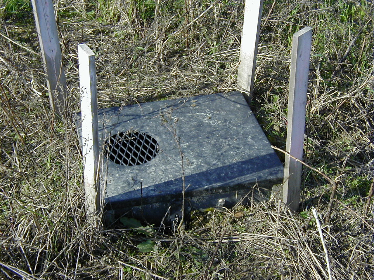 End of output pipe. Excess water flows out of pipe on to open field area.